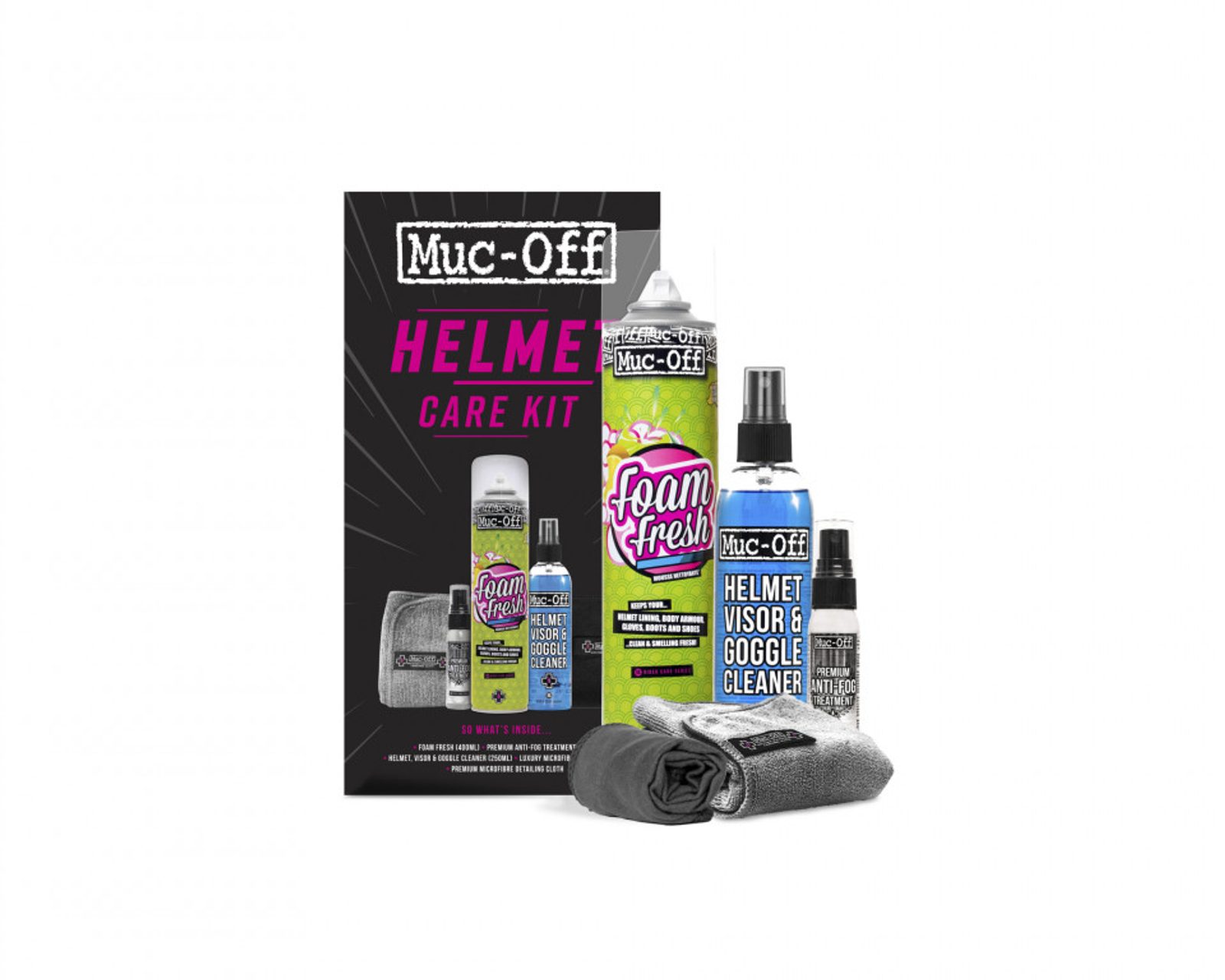 Čistící pěna, čistič hledí, prémiová úprava proti zamlžování, utěrka z mikrovlákna a jemná – finální utěrka z mikrovlákna – všechny náležitosti, které jezdec potřebuje k udržení své helmy v nejlepším stavu po celou sezónu.