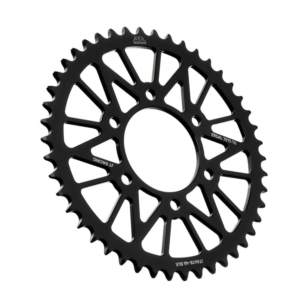 JT používá výhradně ty nejkvalitnější materiály. Pro závodní lehké rozety je to hliníková slitina letecké kvality 7075-T6, pro přední pastorky extrémně pevná slitina SCM420 (chrom-molybdenová ocel) a pro zadní ocelové rozety jako jediný výrobce používá ultra odolnou uhlíkovou ocel C49.