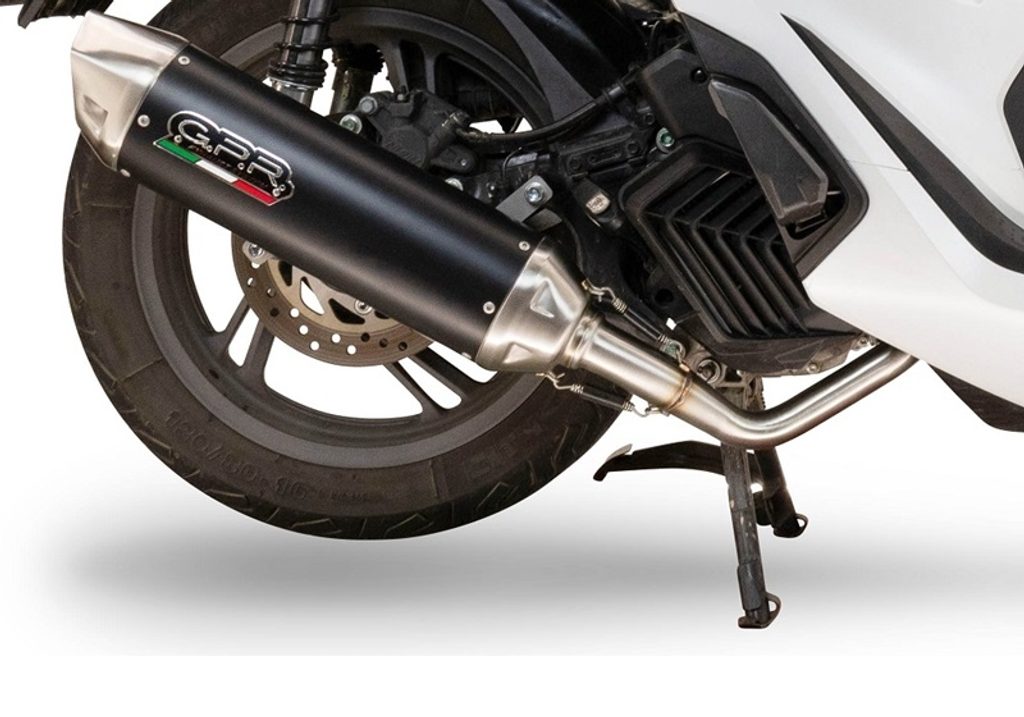 Tlumič výfuku skútru FURORE-X od společnosti GPR má černé hliníkové tělo s krytkami INOX 304 vyrobenými CNC obráběním. Má keramickou povrchovou úpravu, která odolává vysokým teplotám, a eliptický tvar o rozměrech 90 x 120 mm.