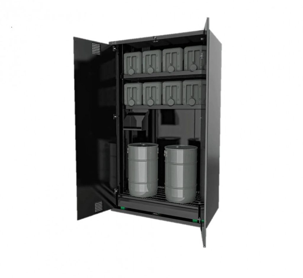 Skříň na skladování olejů vybavená zámkem na klíč, třemi výsuvnými a výškově nastavitelnými policemi, záchytnou vanou na olej a ventilačními otvory pro cirkulaci vzduchu.