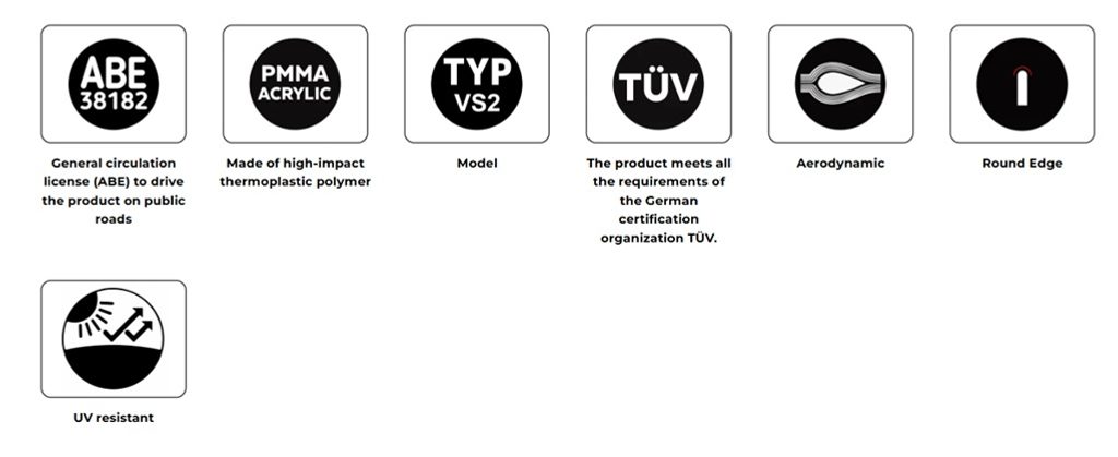 Turistická plexi jsou vyráběna s využitím nejmodernějších technologií z 4mm akrylátového materiálu s UV ochranou a zaoblenou hranou 2 mm. Tento povrch dodává elegantnější vzhled a zvyšuje bezpečnost, přičemž splňuje normy německého TÜV.