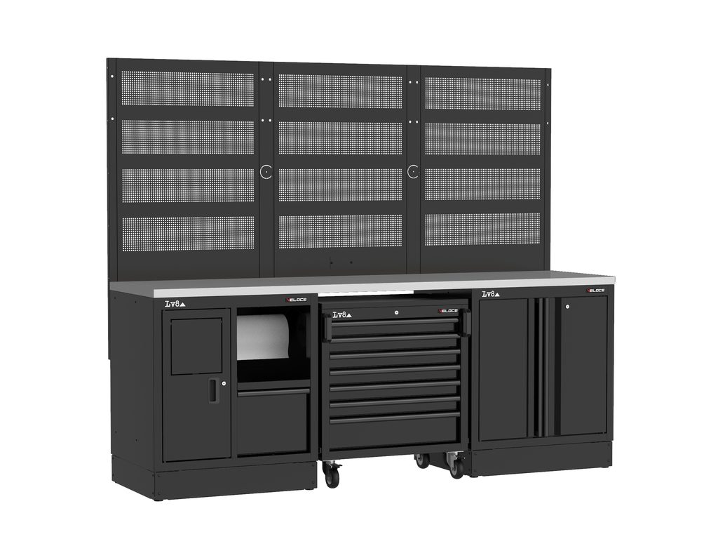 Pracovní stůl délky 2400 mm se servisní skříňkou (držák na papír a úložná zásuvka), 7 zásuvkovým pojízdným vozíkem a dvoudveřovou skříňkou s nastavitelnou policí a zámkem. Masivní dřevěná pracovní deska, tři perforované panely na nářadí a příprava pro elektrickou zásuvku. K dispozici také ve variantě s nerezovou nebo melaminovou deskou.