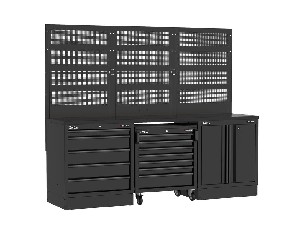Pracovní stůl délky 2400 mm s 5 zásuvkovou skříňkou, 7 zásuvkovým pojízdným vozíkem a dvoudveřovou skříní s nastavitelnou policí a zámkem. Masivní dřevěná pracovní deska, perforované panely na nářadí a příprava pro elektrickou zásuvku. K dispozici také ve variantě s nerezovou nebo melaminovou deskou.