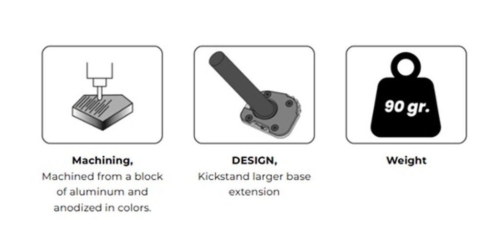 Navržena tak, aby zabránila možnému pádu motocyklu během stání. Tento díl, s 100 % širší základnou než originál, umožňuje bezpečně parkovat na měkkém nebo nerovném povrchu. Jedná se o kombinovaný díl, kde jedna část je z nerezové oceli a druhá je soustružená z hliníkového bloku s anodizovanou úpravou. Tyto materiály poskytují vysokou odolnost při zachování nízké hmotnosti (110–160 g v závislosti na modelu).