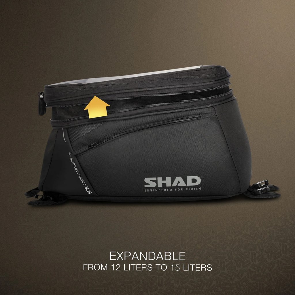Rozšiřitelná tanková brašna s reflexními prvky pro zvýšení bezpečnosti.