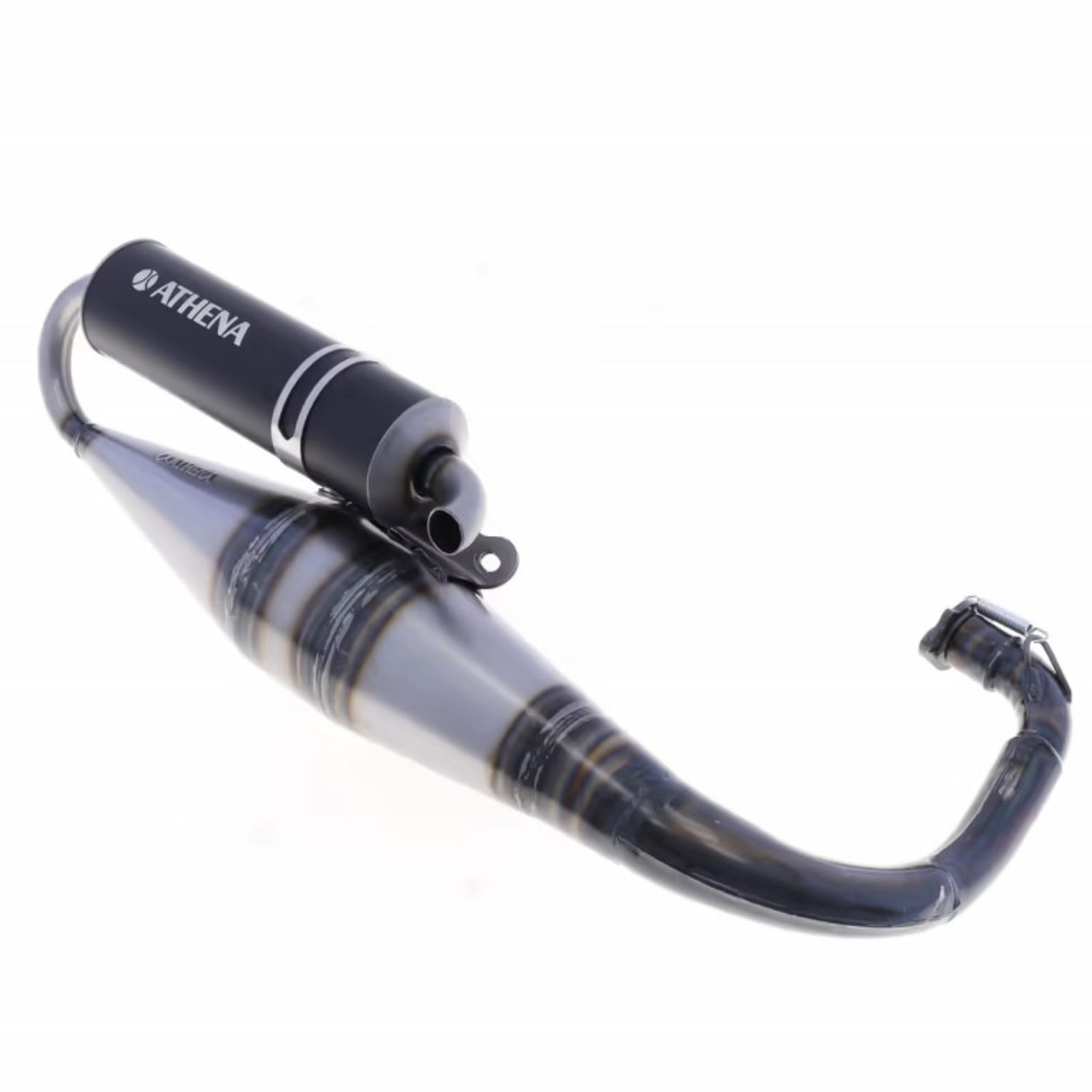 • Černý hliníkový tlumič Ø70 mm – vyšší odolnost a agresivní vzhled s bílým laserově gravírovaným logem Athena