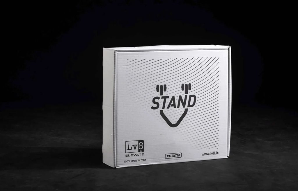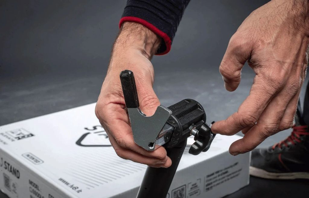 Patentovaný zadní stojan na motorku dodávaný ve třech snadno montovatelných dílech - lze ho sestavit bez použití šroubů a šroubováků.